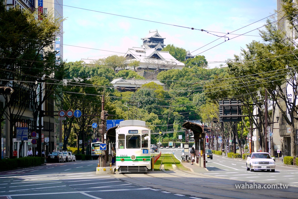 日本很多城市都還留有過往的城池(包括重建),但或許因為高層建物的阻擋、地勢不夠高或是離路線太遠,大部份路面電車沿線並不容易看到,但也有少數例外,熊本市電就是其中之一。在熊本市電的「通町筋」車站附近,縣道28號就剛好正對著日本三名城之一的熊本城,不僅乘客在車內就能看到雄偉的熊本城景色,等車時或在路面,也是一幅非常漂亮的風景。
