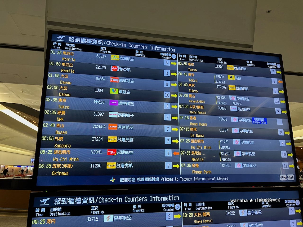 來到出境大廳,時間還沒過午夜!還是先來看一下航班和報到櫃檯。可以看到半夜最後一班是02:40往釜山,再來就是05:55虎航往札幌的IT234,一個小時內虎航還有往沖繩、東京2班的航班,東京兩班還只差5分鐘;然後7點後就換華航大軍密集起飛了。