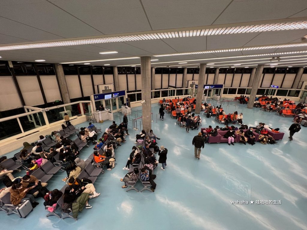 只不過這樣睡還是不太安穩,也可能是平常的作息就是晚睡晚起,看看手機,閉閉眼睛,就是睡不著,總算撐到3點半,想說拉著行李到一樓看看,這才發現已經開櫃讓搭機旅客報到了,而且已經不少人在排隊了。那還等什麼?趕快上前跟著排啊!