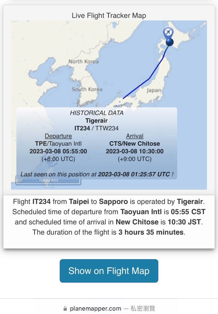 下了飛機後,連接上網路,立刻連到航班追蹤網站查看飛航路徑。原來啊!直飛北海道的班機走最近航路,所以飛過九州和中國地區後(這時在睡覺)就沿著日本海飛,靠左側窗戶就只看到一整片海,預期中的富士山自然是看不到的。