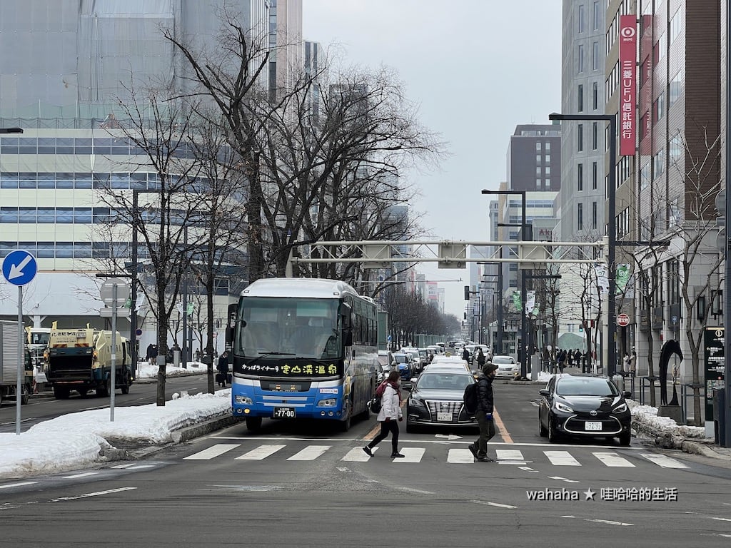 正對著札幌車站的是札幌市中心最主要的道路之一「札幌駅前通」。因為住的旅店在西9丁目通附近,稍稍遠離鬧區,搭電車應該是搭地鐵到すすきの後再轉札幌市電搭一站到「資生館小學校前」下車,但是看看也沒下雨下雪,就決定拉著行李箱慢慢走過去,看看街景也可以省錢車費。