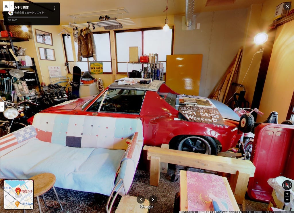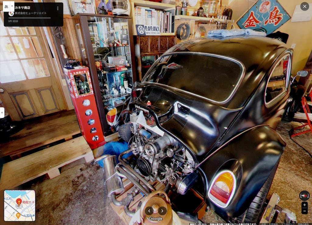 有趣的是,在Google Maps裡面查看「箱館カネサ商店」時,還有2020年3月時的車庫360度照片,那時竟然還有寬體改裝的黑色金龜車!